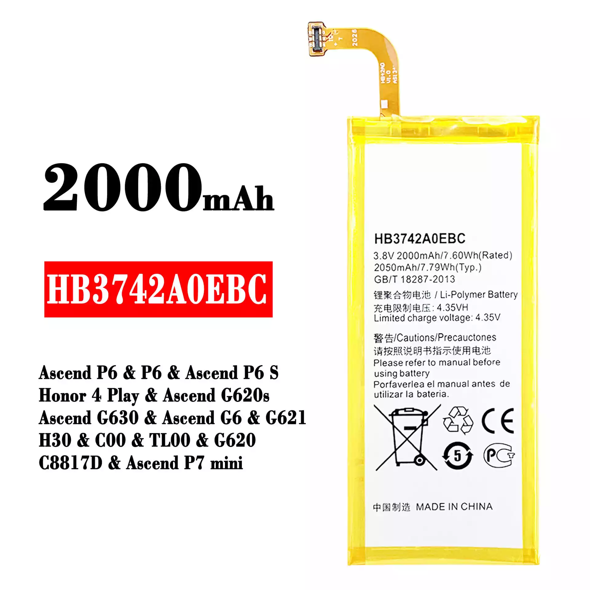Baterija HB3742A0EBC za HUAWEI Ascend P6 / P6 / Ascend P6 S / Honor 4 Play / Ascend G620s / Ascend G630 / Ascend G6 / G621 / H30 / C00 / TL00 / G620 / C8817D / Ascend P7 mini